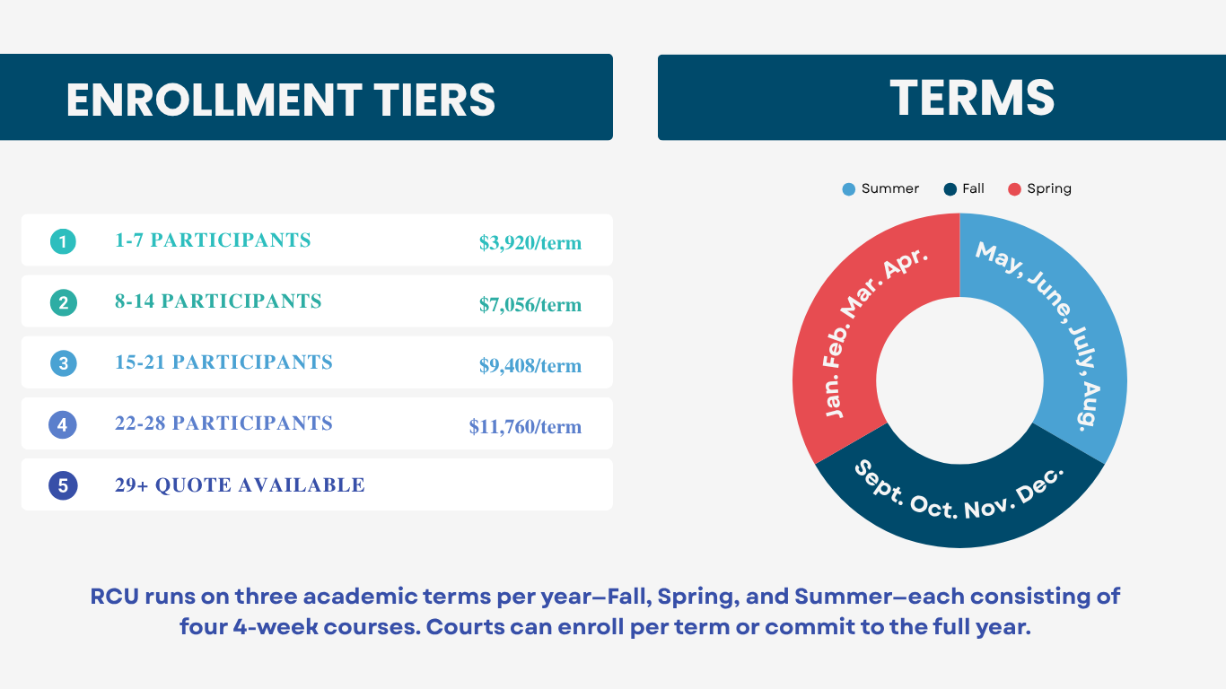 Recovery Court University (RCU) provides extra support and life skills for your participants in Recovery Court in an online “university-style” setting. The idea is to make learning about important life skills more interesting and different from regular treatment. The goal is to help your participants stay more engaged and get better results in Recovery Court.